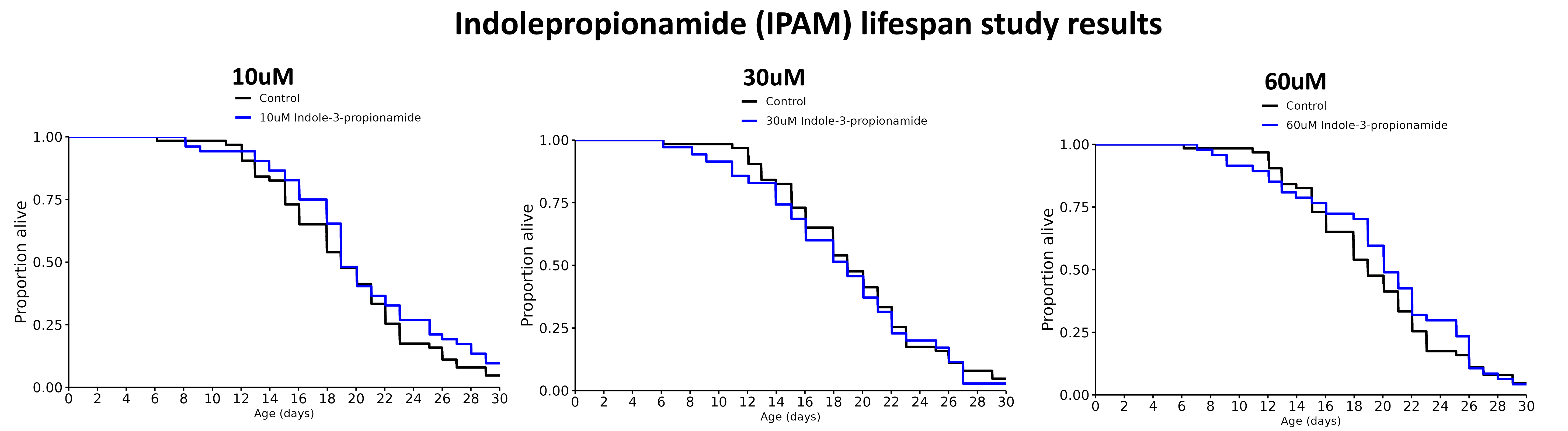 Psilocybin, which is an illegal substance in the UK, has been more recently found to have life extending properties in mice. It is an indole. Melatonin is also an indole. Perhaps the indole with the most effective lifespan results was Indolepropionamide (IPAM) which was found to give a 268% lifespan increase in Rotifers. This attracted the interest of the Rapamycin fan club a group of whom clubbed together to get some lifespan experiments done with C. elegans. Sadly it did not seem to make that much difference, but the results are published below. Further experimentation is being done with higher doses. The highest dose (60uM) resulted in an increase in the size of the worms similar to the size increase in rotifers. This, in combination with no evidence of toxicity at these doses, indicates that similar lifespan effects may be possible at higher doses, and this is why higher doses are being explored. Some individual self experimenters (not the author on this occasion) are experimenting with IPAM. There are not really any anecdotal conclusions, but it is worth reporting the interim negative results.